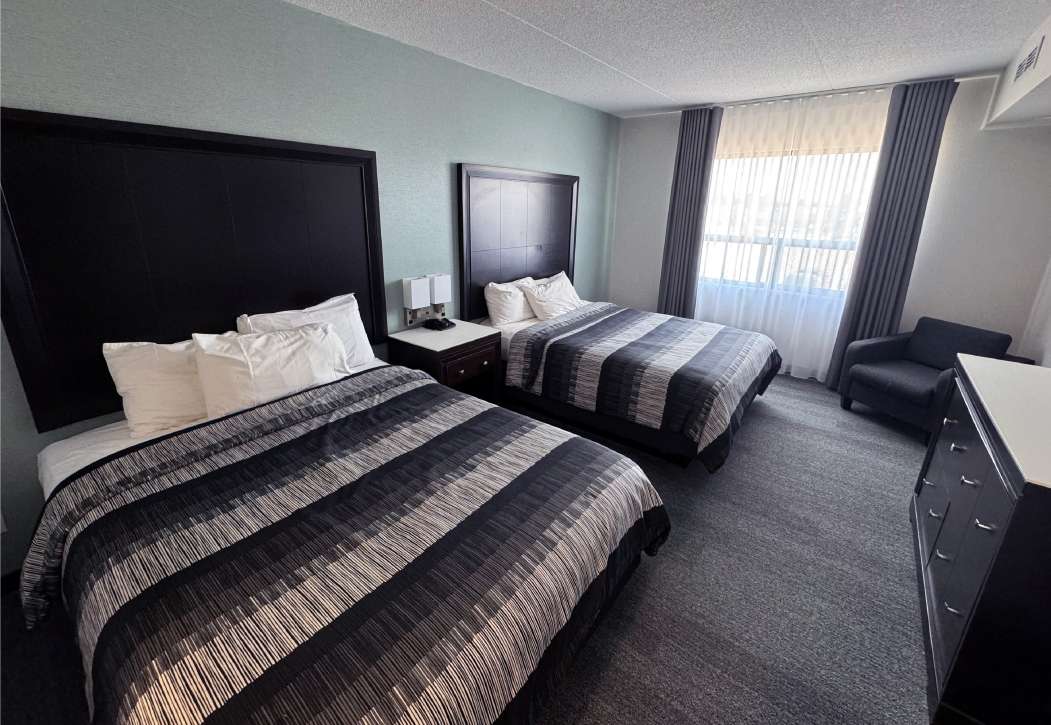 This spacious guestroom offers two queen size beds, and is ideal for a family of up to four. When reserving this room you can request a connecting room, or walkout patio/balcony. The room amenities include free wireless access, small sitting area, television, mini fridge, microwave, coffee maker iron, ironing board and hair dryer. This room is great for a family looking for a little bit larger accommodation. Receive up to 4 Unlimited Passes for Waves Indoor Waterpark when you reserve this room. 1 rollaway (cot) can be added to this room upon request (additional fee of $20 per night)