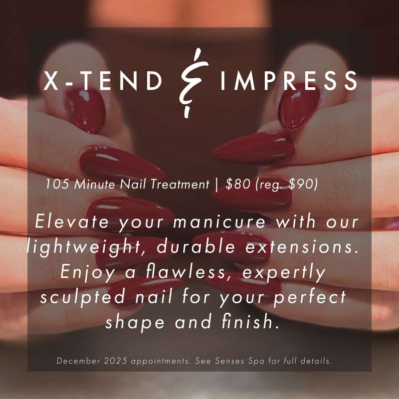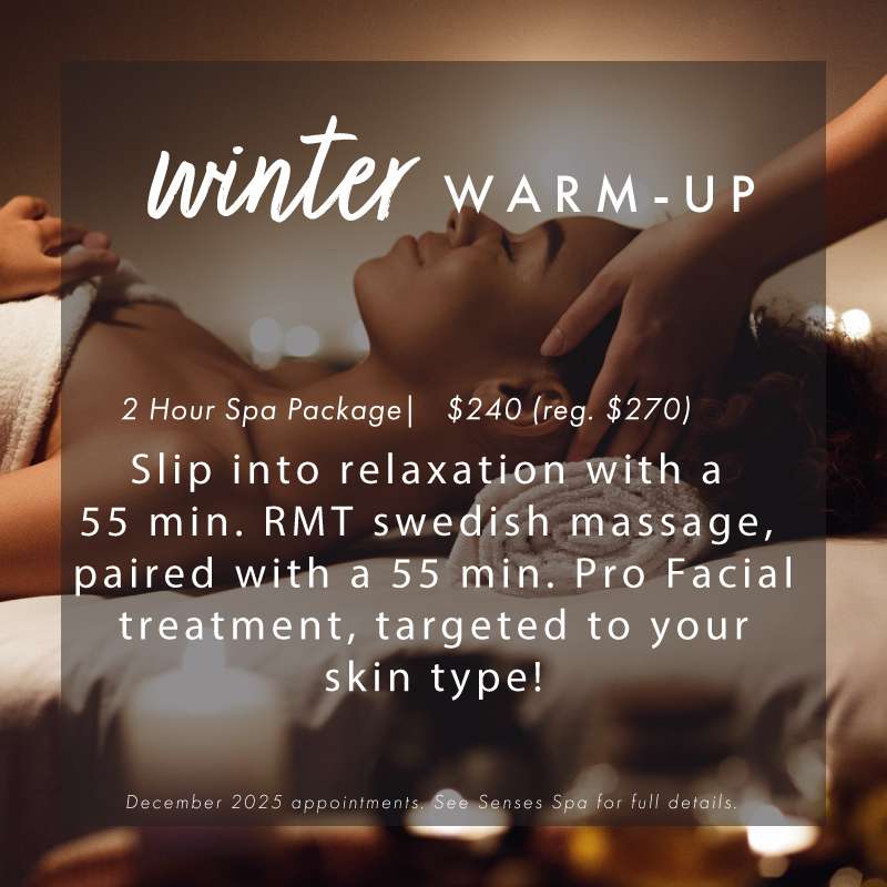 *All December Senses-ations are available for December 2025 appointments at Senses Spa & Boutique. Offers cannot be combined with any other promotion or offer. Bonus Spa Dollars are available with an in person gift card purchase (min. gift card purchase $100). Gift cards are not available for online purchase. See Senses Spa staff for full details.